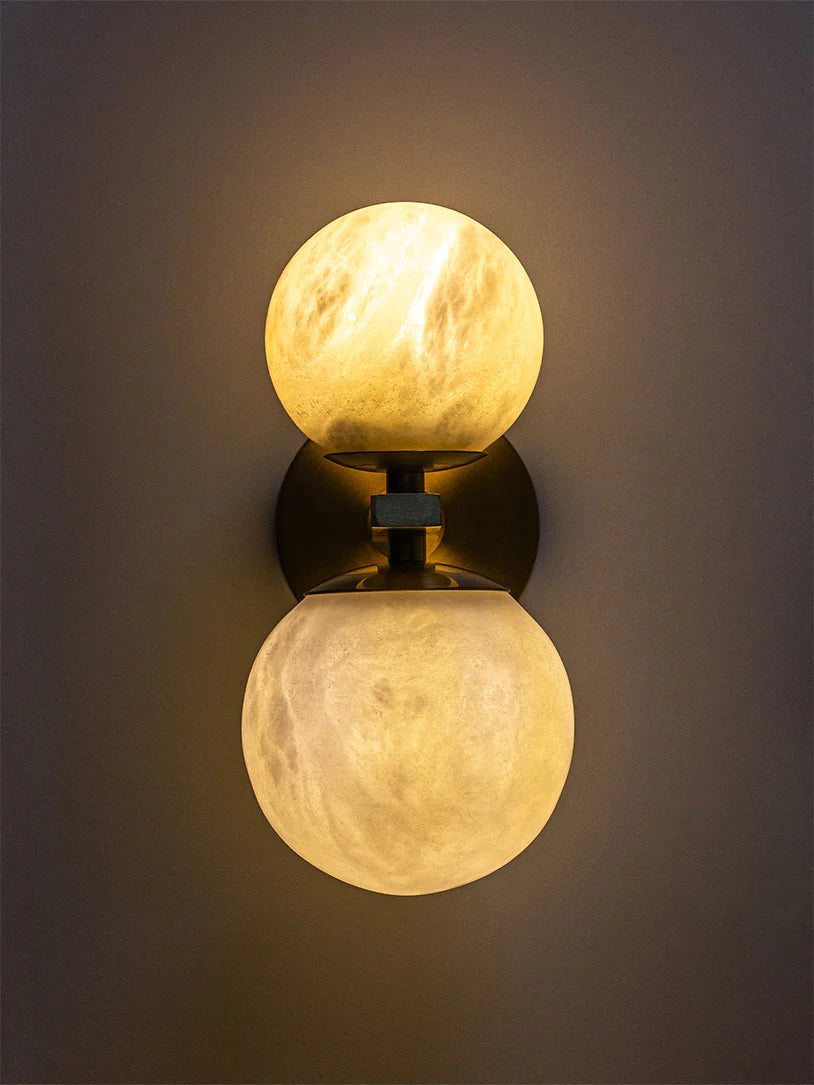 Two orbs sculpted from alabaster stone, supported by a chic brass finish. This wall light displays luxurious ambiance wherever placed internally.