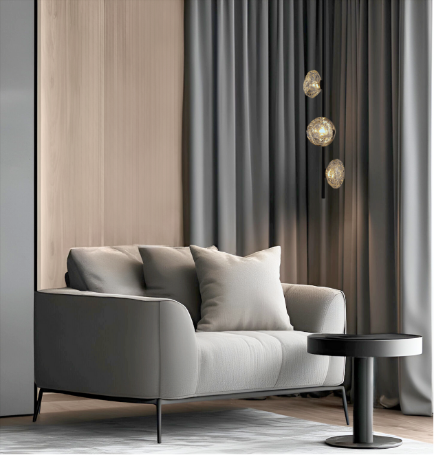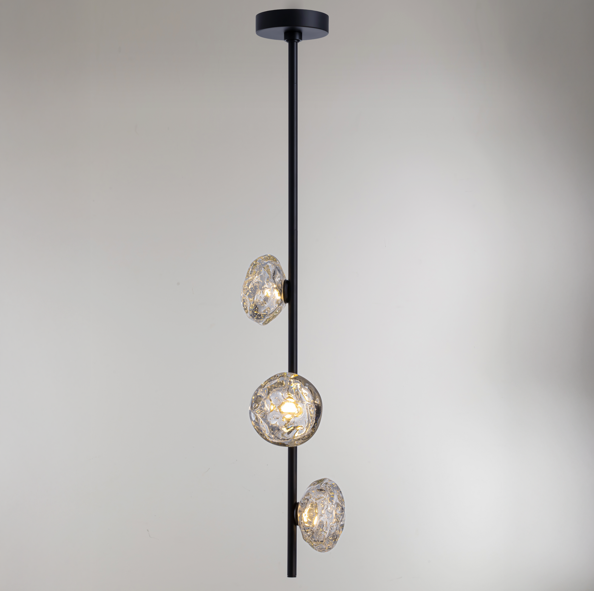 The Celeste Vertical Pendant features three hand-blown glass forms suspended along a sleek vertical frame. Each glass piece glows with a celestial radiance, creating a sculptural statement. As part of our Celeste Collection, it pairs seamlessly with the wall and linear designs for a cohesive, luminous aesthetic.