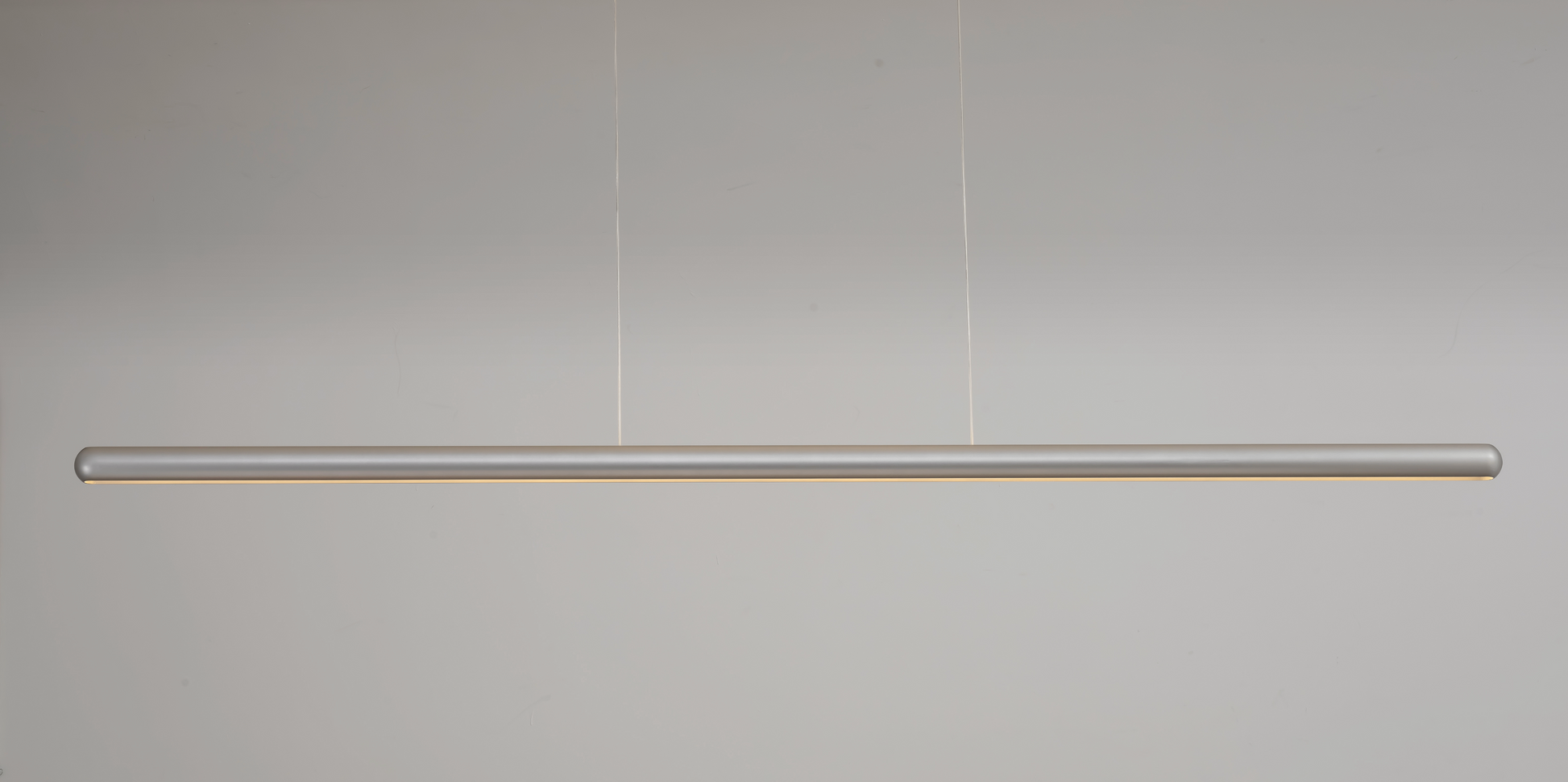 This sleek linear pendant features a smooth nickel finish with a soft, diffused glow that enhances interiors. Its minimalist form makes it perfect for a variety of spaces.