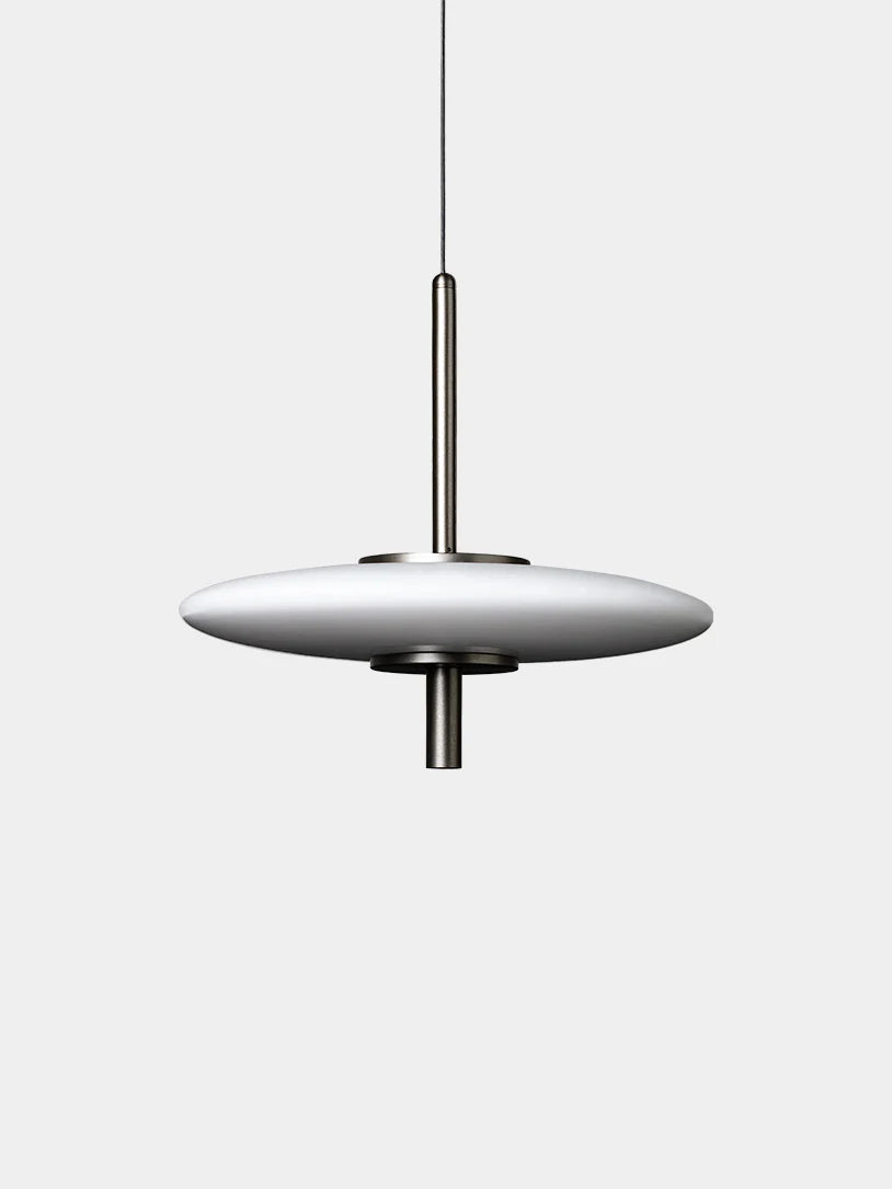 A glowing, saucer-shaped pendant in milky white provides both ambient internal light and a functional downlight from its stem. Adjusting the cable length allows you to customise the diameter of the light it projects.